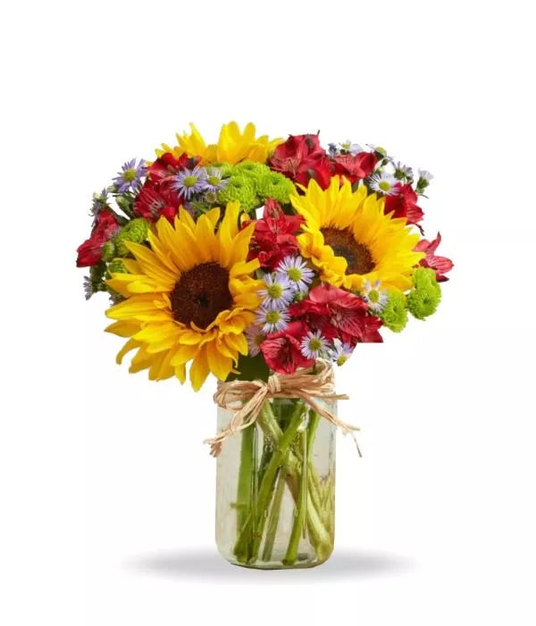 - Featured Flowers: Includes radiant sunflowers, vibrant button mums, red alstroemeria, and delicate daisies.